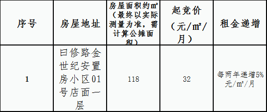 为提高国有资产经营效益,南昌市昌北开放开发区开发建设总公司位于金世纪安置房小区修路国有资产,房屋所在该小区01号商铺,共计面积118㎡。现对外公开进行出租经营权竞拍,现对有关事项公告如下: