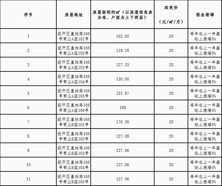 二、本次竞拍采用有底价、有声竞拍的形式。竞拍开始后,首次叫价为增幅后报价,不低于20.5元/平方米/月,每次报价增幅最低不低于0.5元/平方米/月的整倍数,如出现竞拍人仅举牌不叫价情况,即默认为在上一轮叫价基础上增加0.5元/平方米/月,否则应价无效。当最高价(超过底价)未有人追加竞价时,主拍人对该价重复三次报价,第三次重复报价无人应价,由主拍人宣布成交。本次竞拍取达到底价的最高报价人作为中标人,中标人若放弃中标人权力,不按排名顺延中标人,我司将做废标处理。