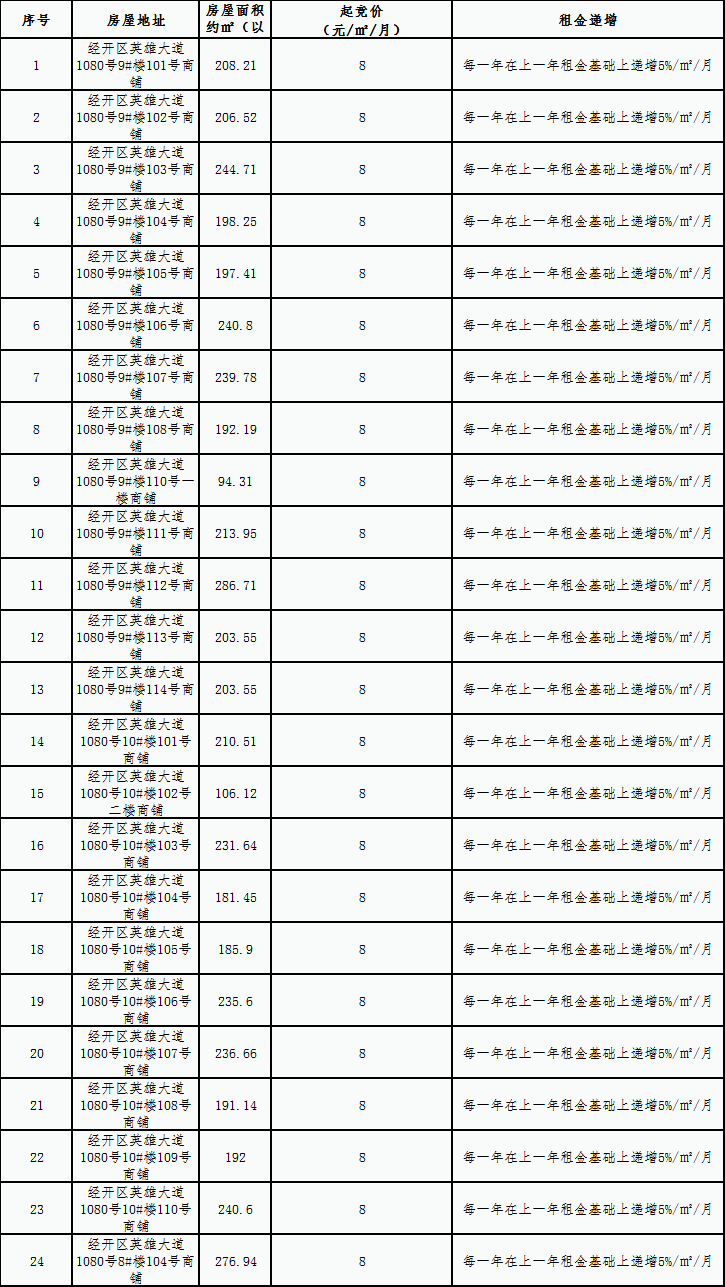一、竞拍人(含个人及企业,下同)应按主拍人提出的加价幅度进行竞拍,竞拍价按每月每平方米报价,房屋竞拍成功后按租期最后一年季度租金金额缴纳合同履约保证金中标人一周内签订合同,履约保证金及预缴首年一个季度租金与季度物业费在签订合同之日内一次性交清,否则做废标处理。二、本次竞拍采用有底价、有声竞拍的形式。竞拍开始后,首次叫价为增幅后报价,不低于8元/平方米/月,每次报价增幅最低不低于0.5元/平方米/月的整倍数,如出现竞拍人仅举牌不叫价情况,即默认为在上一轮叫价基础上增加0.5元/平方米/月,否则应价无效。当最高价(超过底价)未有人追加竞价时,主拍人对该价重复三次报价,第三次重复报价无人应价,由主拍人宣布成交。本次竞拍取达到底价的最高报价人作为中标人,中标人若放弃中标人权力,不按排名顺延中标人,我司将做废标处理。