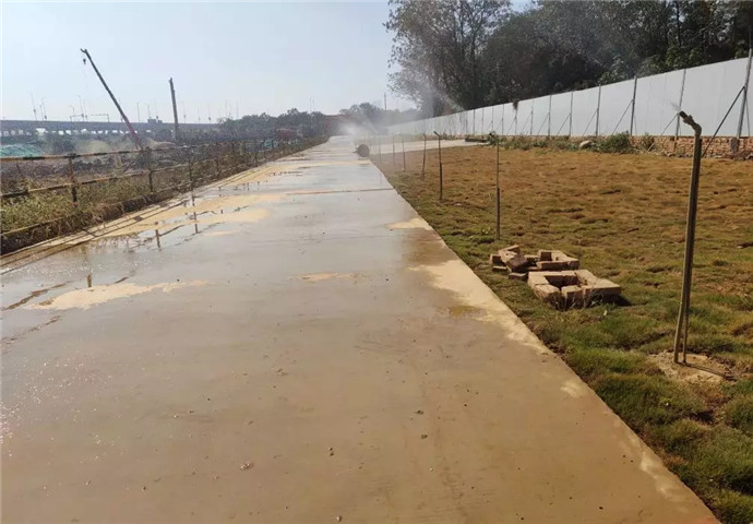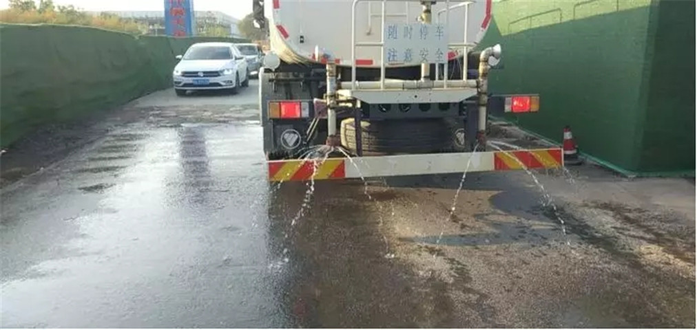 3、空港花园开启雾炮机降尘,清扫洒水门口,开启进出车辆冲洗平台,洒水车清洗道路;