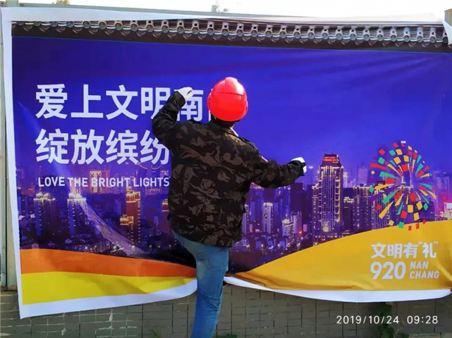 更换粘贴920南昌标语,现场裸土覆盖,开启雾炮机降尘