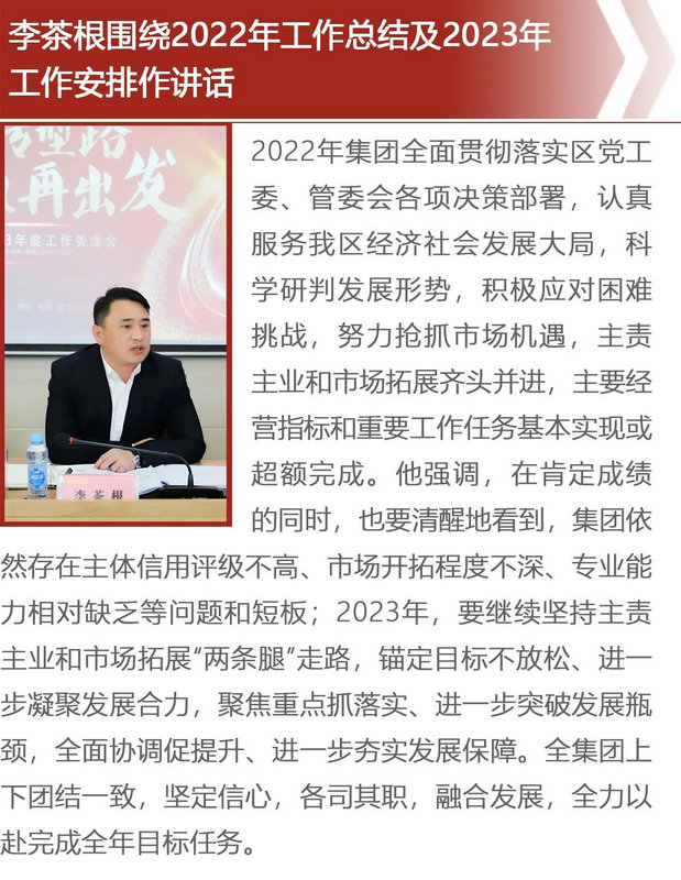 会上,乐动(中国)Ledong·官方网站财务部(融资部)、工程技术部及各子公司作了述职报告,总结了2022年工作,分析了工作中存在的问题和困难,重点谋划了2023年工作。