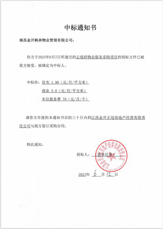 依托专业管理能力及良好企业信誉,南昌金开枫林物业管理有限公司于2023年6月7日成功中标云瑶府物业服务采购项目,为公司市场化经营业绩又添一笔。