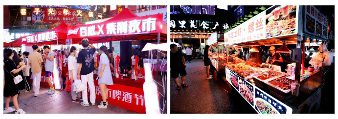 不仅演出精彩纷呈,现场还设立了多个啤酒品牌摊位,设置了啤酒竞饮比拼和多种互动游戏。流动摊车一字排开,人头攒动,各种风情美食,摊前排起长队,年轻人呼朋唤友……大家在热烈的节日氛围中,边吃边看、边喝边玩,灯火交错中,感受着城市的动感与活力。