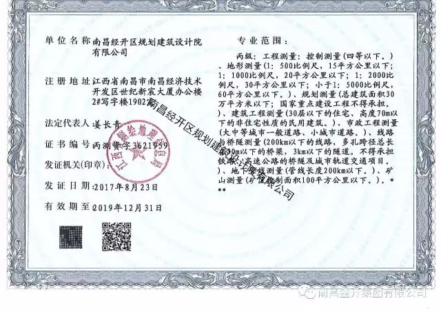 8月15日,从南昌市国土资源局传来喜讯,南昌经开区规划建筑设计院有限公司顺利通过市国土资源局的资质升级审批,并于8月23日通过公示,成为丙级测绘资质单位。9月5日,由江西省测绘地理信息局正式发放《丙级测绘资质证书》。