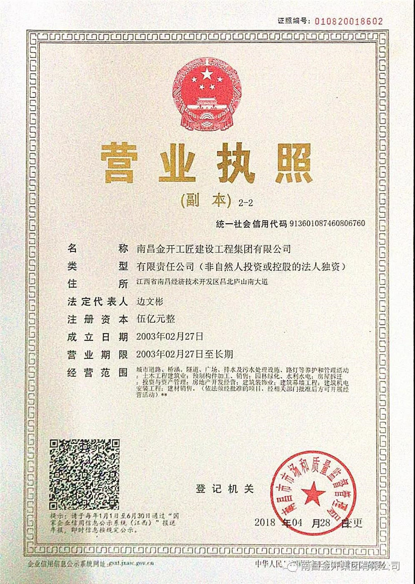 据悉,南昌金开工匠建设工程乐动(中国)Ledong·官方网站有限公司注册资金伍亿元,旗下拥有五家子公司,且具有市政工程施工总承包二级,房建、土石方、城市及道路照明,园林绿化等多项资质。